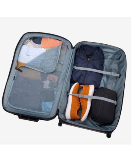 | Çantë udhëtimi me katër rrota që lëvizin 360°, panele kompresimi për të shtyrë rrobat dhe ndarës të brendshëm për organizimin e gjërave. Ka xhepa të jashtëm për akses të shpejtë dhe dorezë teleskopike për të ecur lehtë nëpër aeroporte. Është bërë prej materialesh të qëndrueshme dhe rezistente, ideale për udhëtime të shkurtra me aeroplan. |